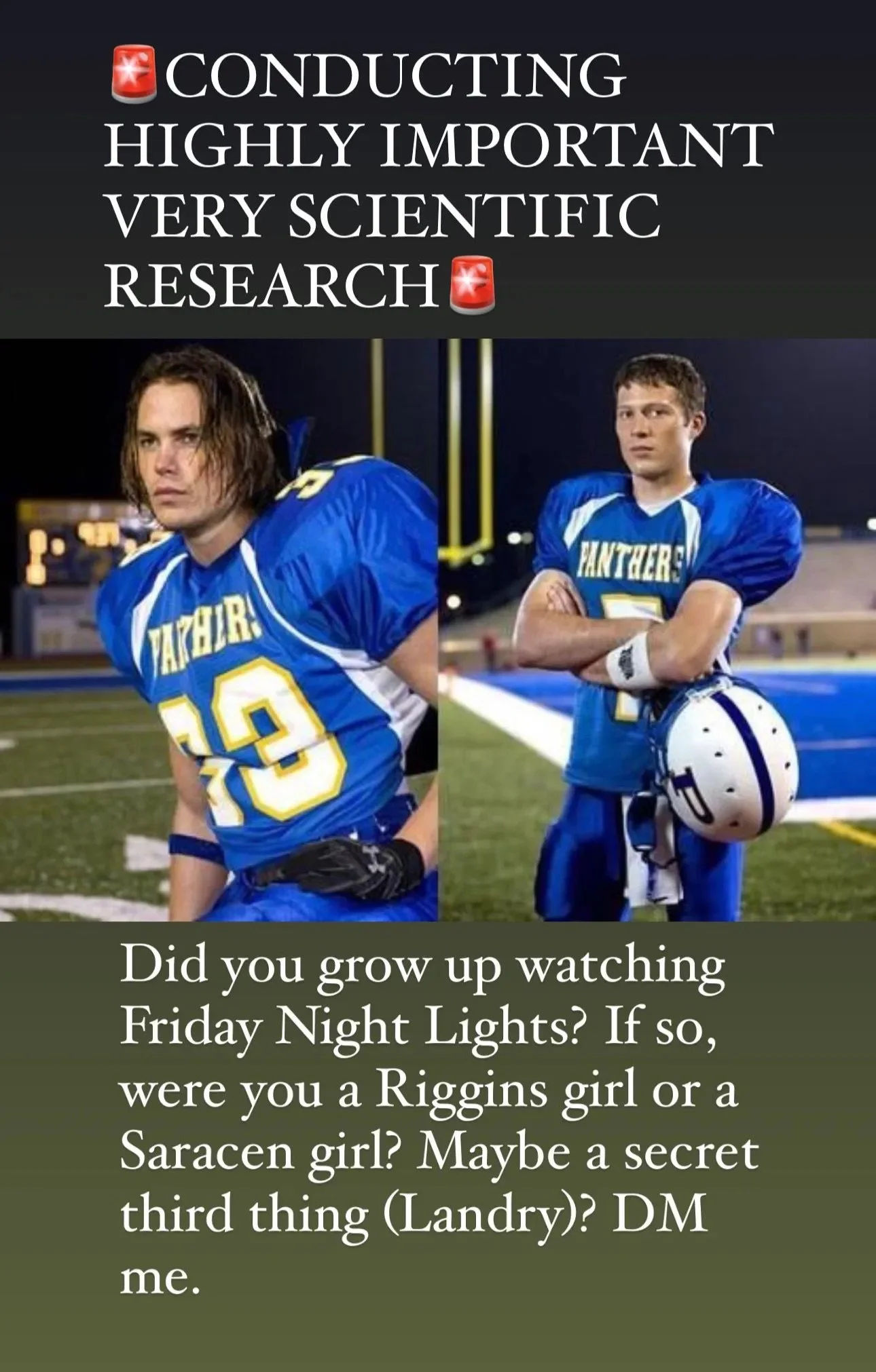 I am a firm believer that you can learn a lot about someone by asking how they self-identify as a Riggins girl vs. a Saracen girl. No one is allowed to get mad at me for that- I am not the first person to suggest that an individual’s identification with, or pull toward one foil character on a teenage soap opera conveys more about them as a person than any zodiac sign or Meyers-Briggs test ever could. Buzzfeed built an entire empire on quizzes that tell you precisely what your thoughts on TV and movie characters say about you.